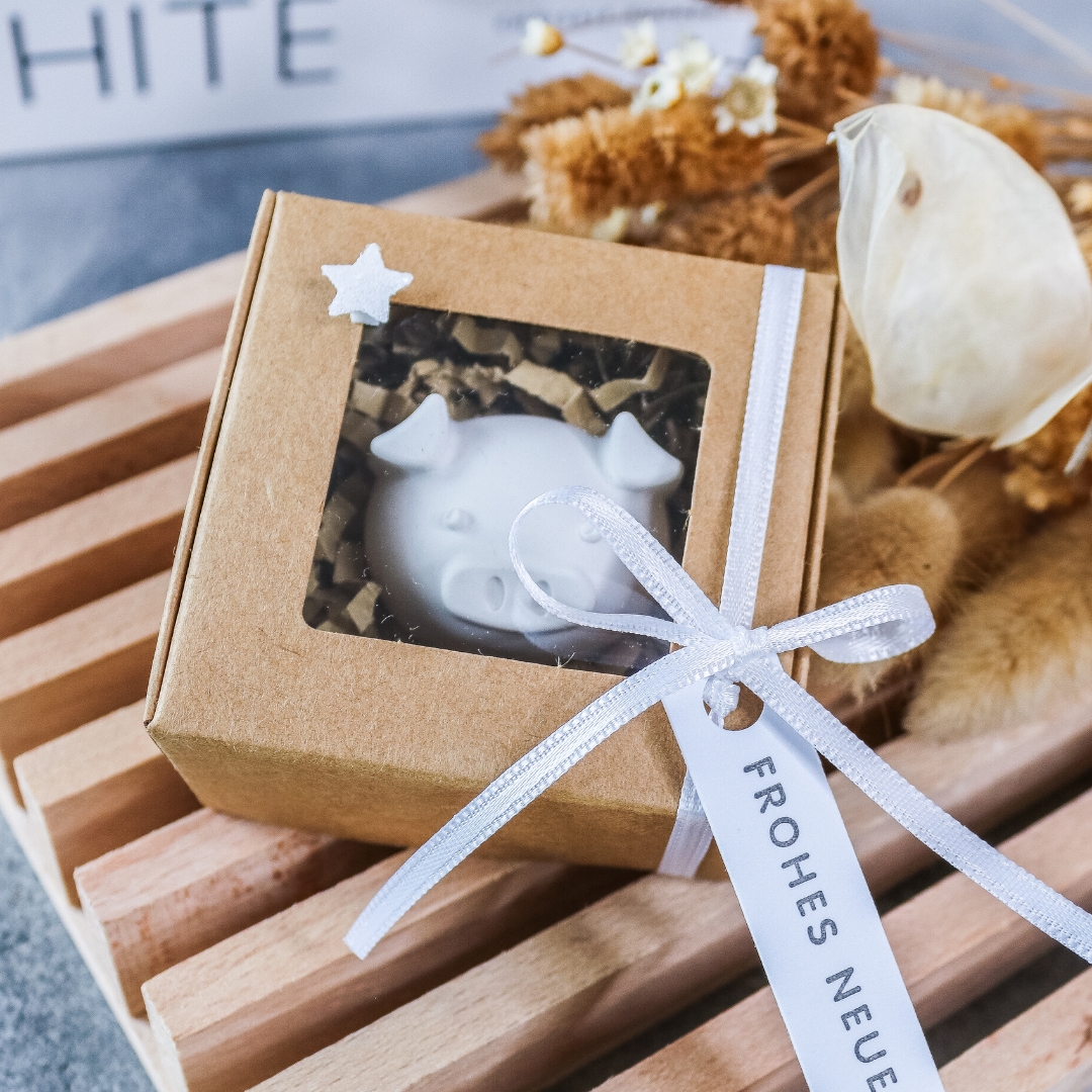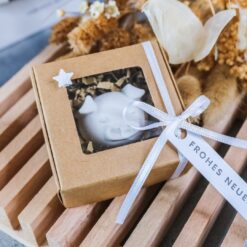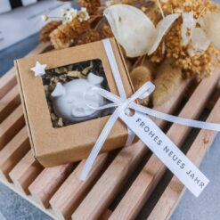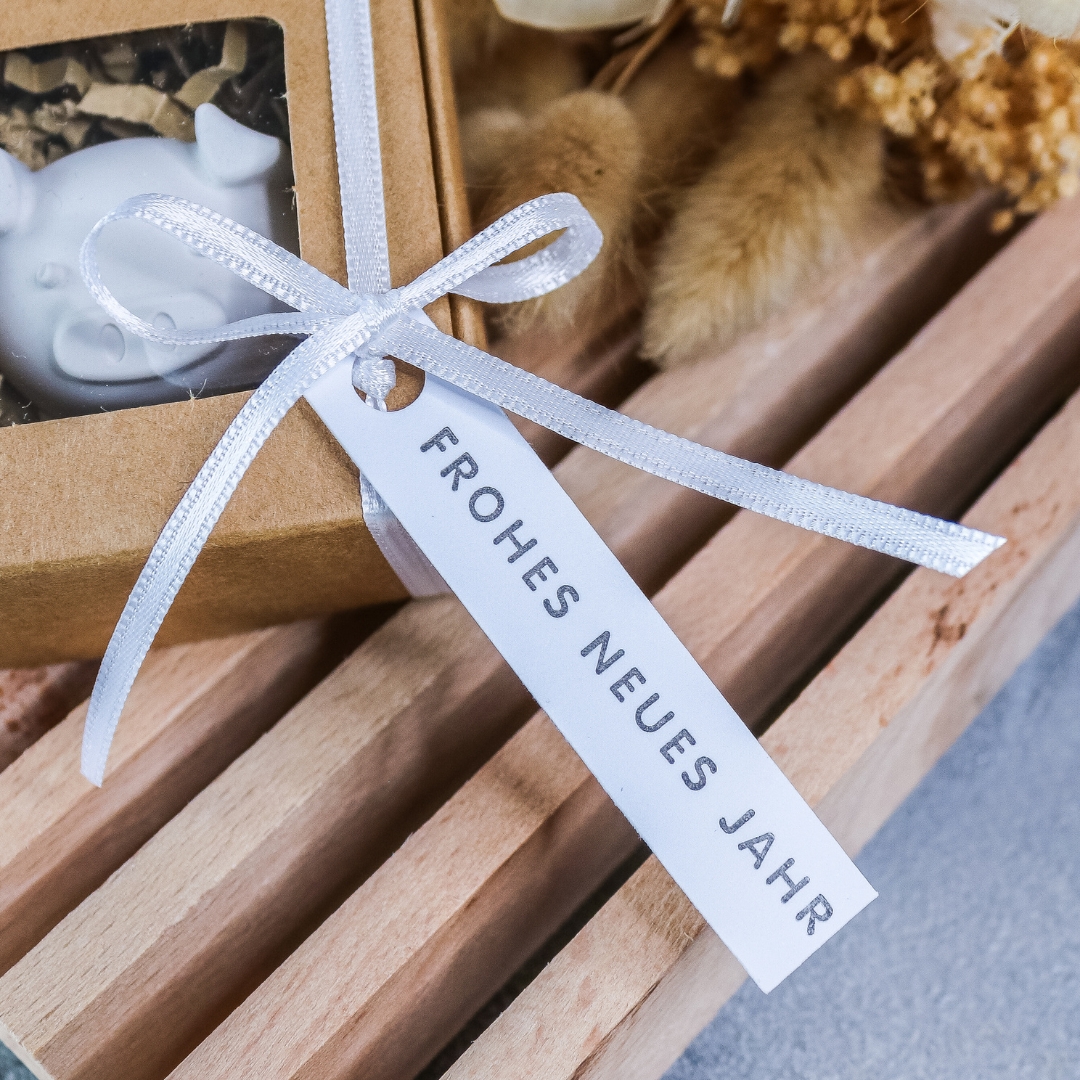 In dem Geschenkkarton befindet sich ein kleines Schwein, welches wir aus dem Gießpulver Raysin gegossen haben. An dem Geschenkkarton befindet sich ein Anhänger mit der Aufschrift Frohes Neues Jahr.