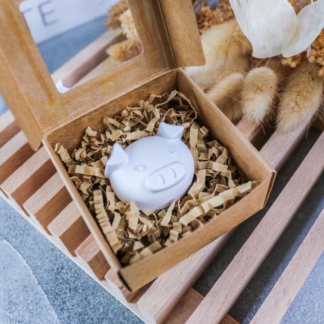 Mini Schwein aus dem Gießpulver Raysin, Größe des Geschenkkartons ca. 6 x 6 x 3 cm. Handgefertigt mit viel Liebe.