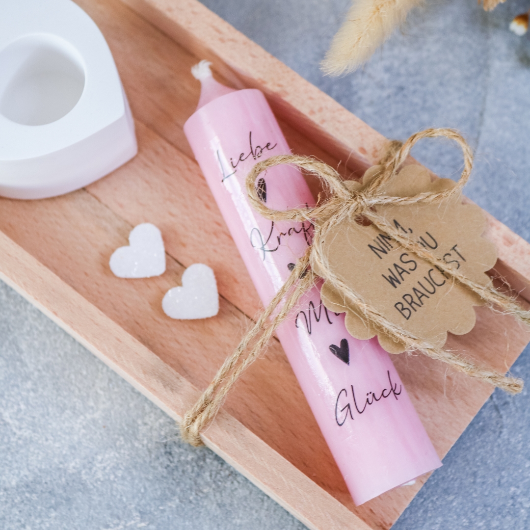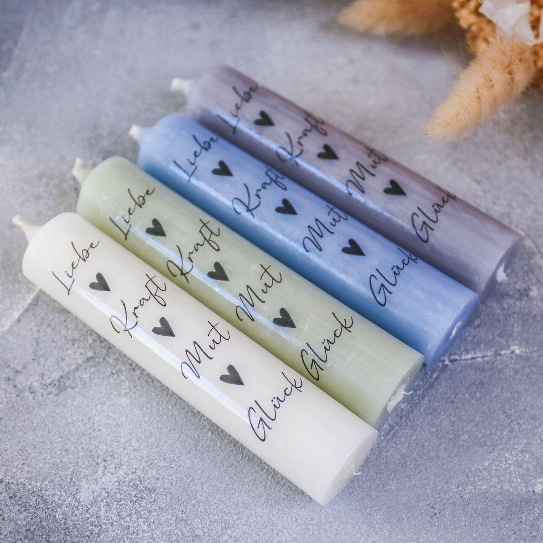 Nimm, was du brauchst – Liebe, Glück, Kraft, Mut als Stabkerze. Diese wunderschönen Kerze mit Motiv sagen so viel mehr als viele Worte. Sie kommen von Herzen. Die Stabkerze ist wunderschön als Dekoelement oder auch für einen gemütlichen Abend bei Kerzenschein.