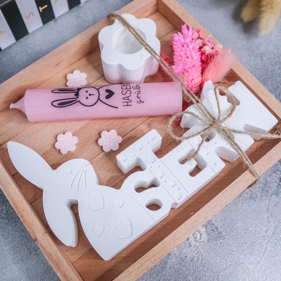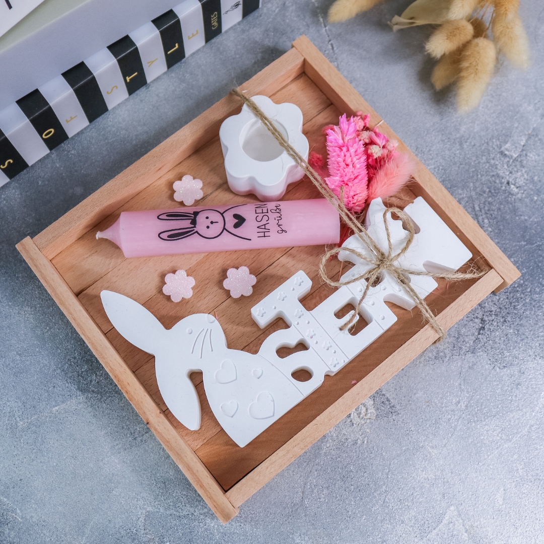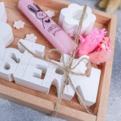 Du suchst nach einem persönlichen Geschenk für Ostern? Dann ist unser Geschenkset Ostern die perfekte Geschenkidee. Die Kerze mit der Beschriftung Frohe Ostern bzw. Hasengrüße befindet sich in einer passenden Geschenkverpackung aus Holz, zusammen mit einem Dekoelement (Schriftzug ca. 15 x 9,5 cm) und Kerzenständer aus Raysin und ist fertig verpackt zum Verschenken.