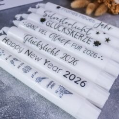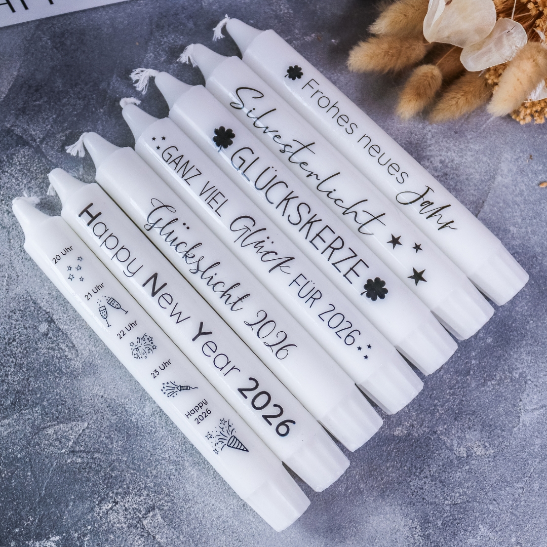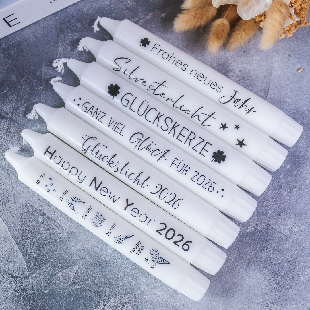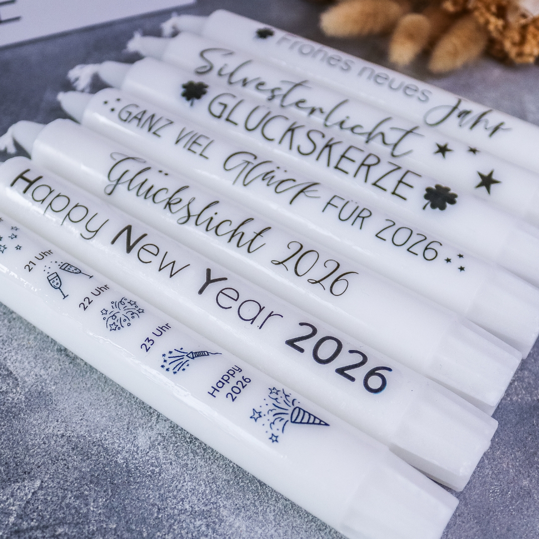 | Beschriftung | Silvester Countdown, Happy New Year 2026, Silvesterlicht, Ganz viel Glück für 2026, Frohes neues Jahr, Glückslicht 2026, Glückskerze |