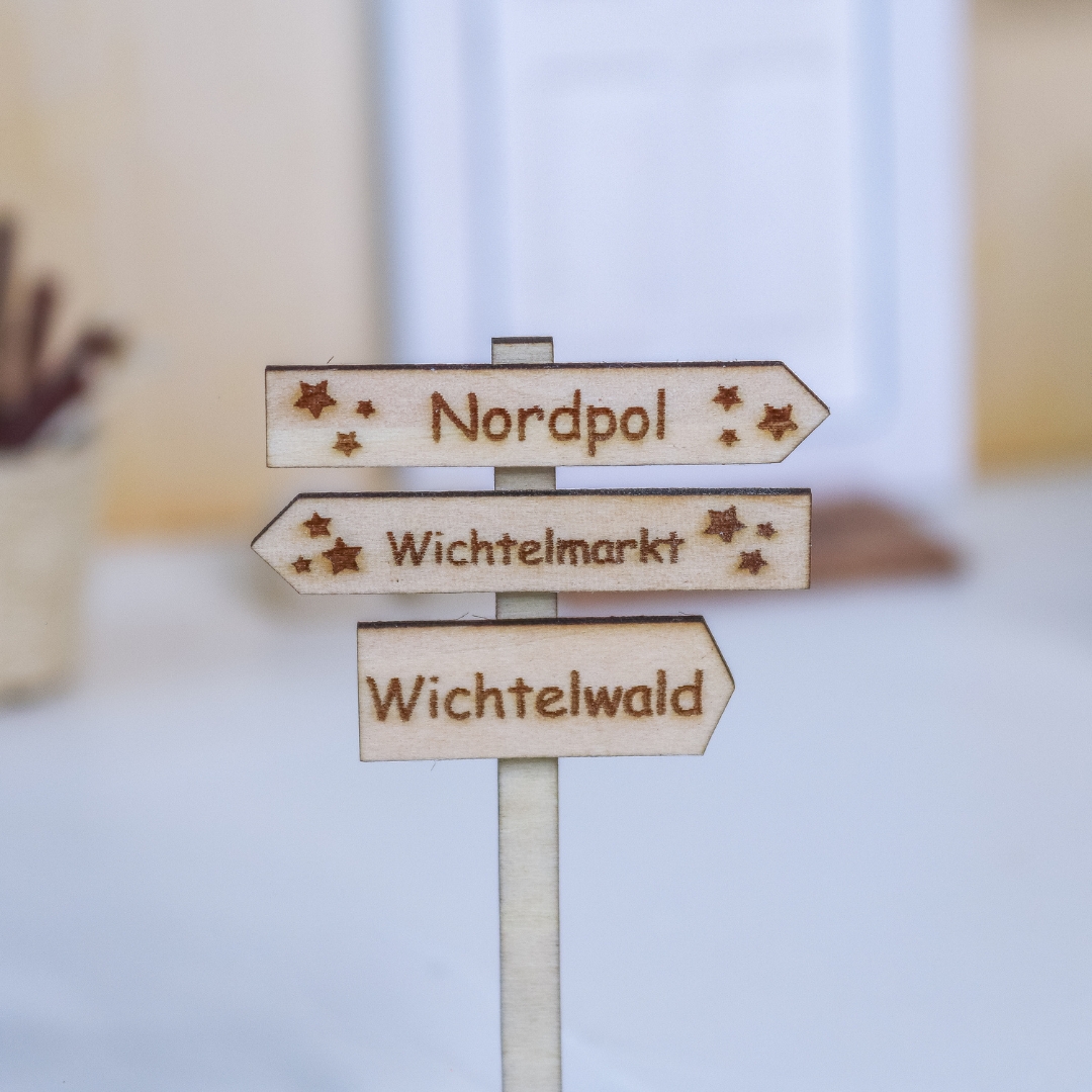 Wegweiser aus Holz für deinen Wichtel oder Wichtelin – perfekt für deine Wichteltür / Elfentür als Ergänzung. Der Wegweiser hat 3 Beschriftungen: Nordpol, Wichtelmarkt, Wichtelwald.